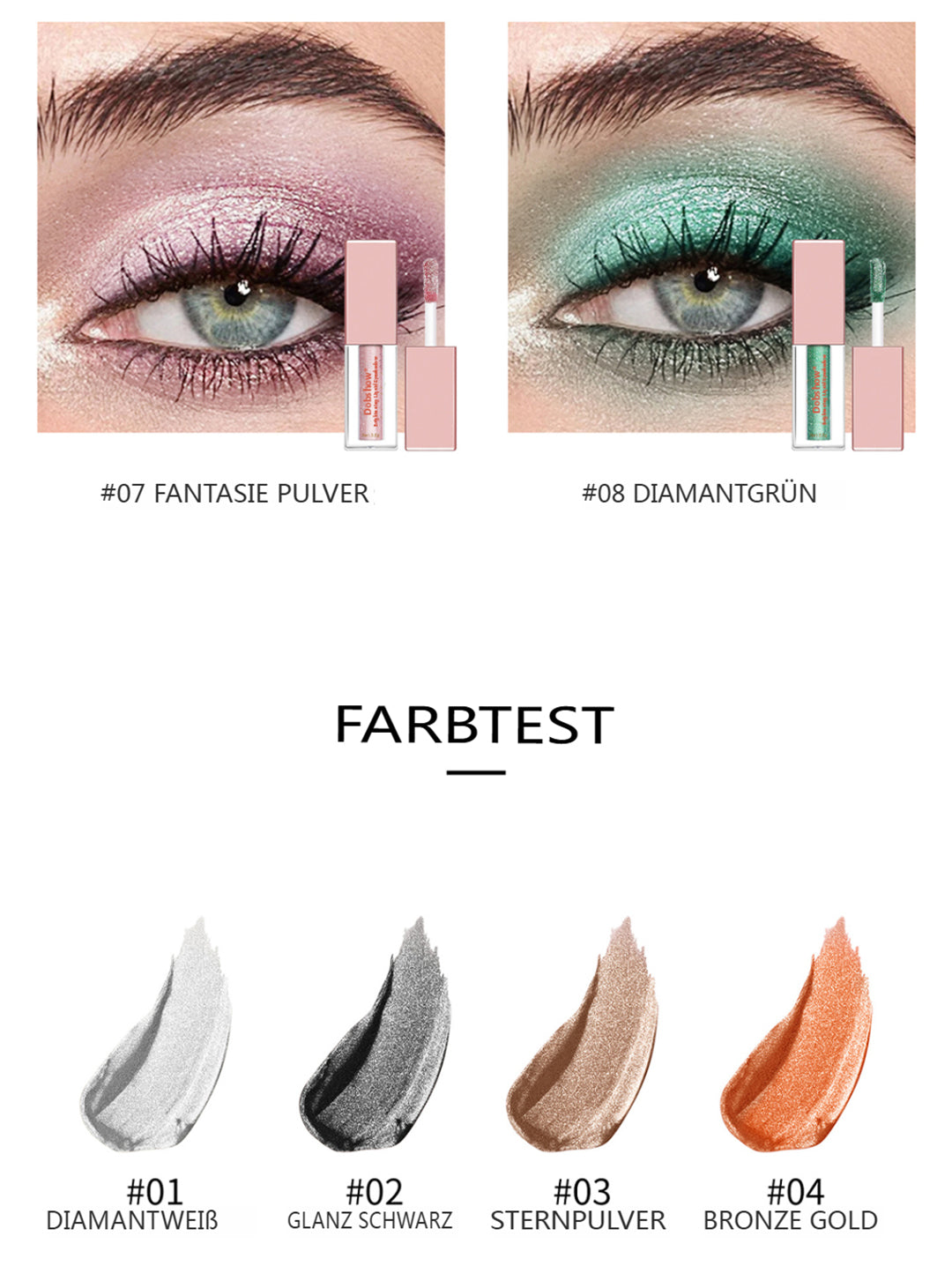 Der Dobshow® Aufhellende Flüssig-Lidschatten vereint intensive Perlpigmente und große Glitzerpartikel in einer einzigartigen Formel. Perfekt für einen glamourösen Look mit Wow-Effekt – ideal für Partys oder den täglichen Glow.